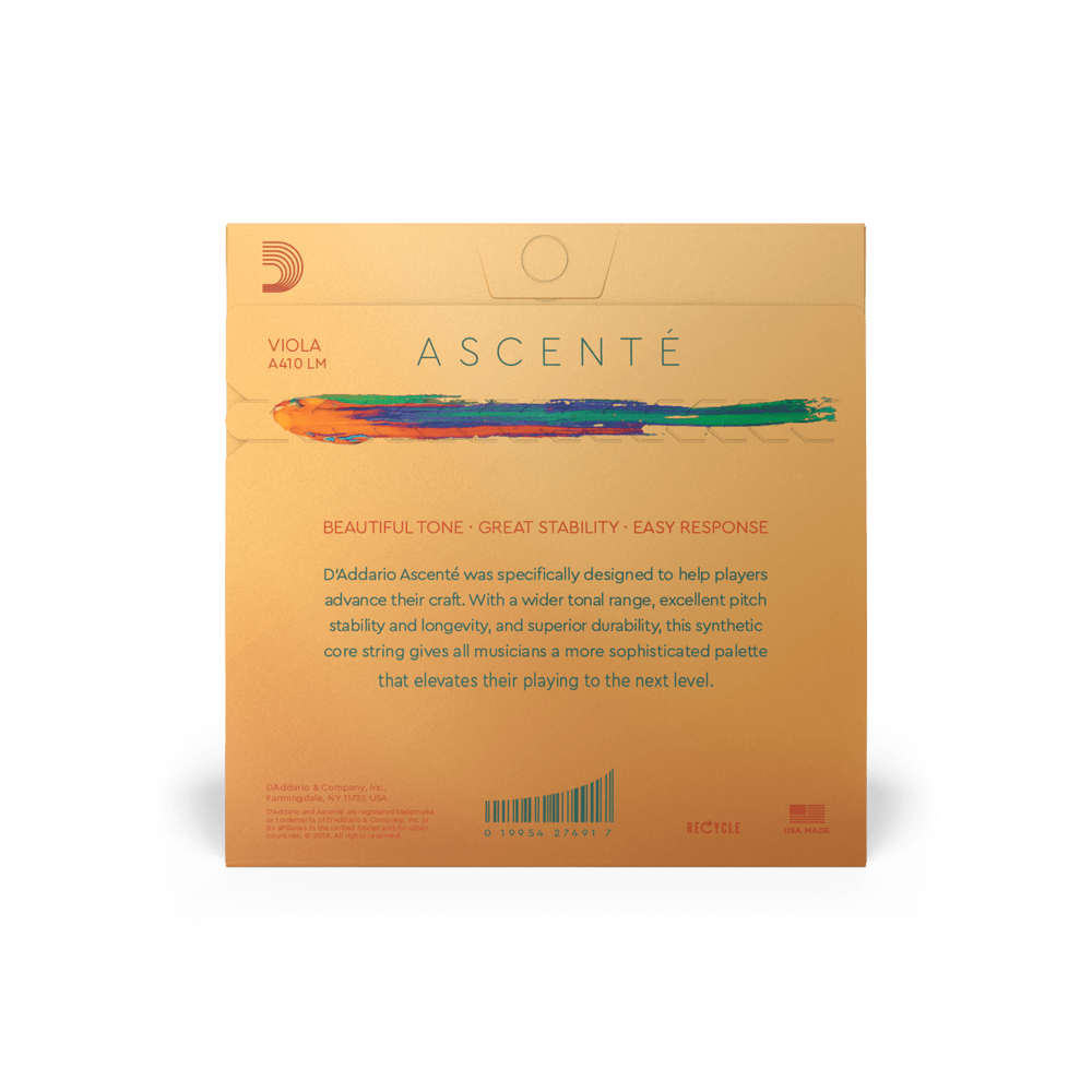 Ascenté viola strings were specifically designed to help players advance their craft with elegance and consistency. With a wider tonal range, excellent pitch stability and longevity, plus superior durability, this synthetic core string delivers a more sophisticated palette that elevates playing to the next level.