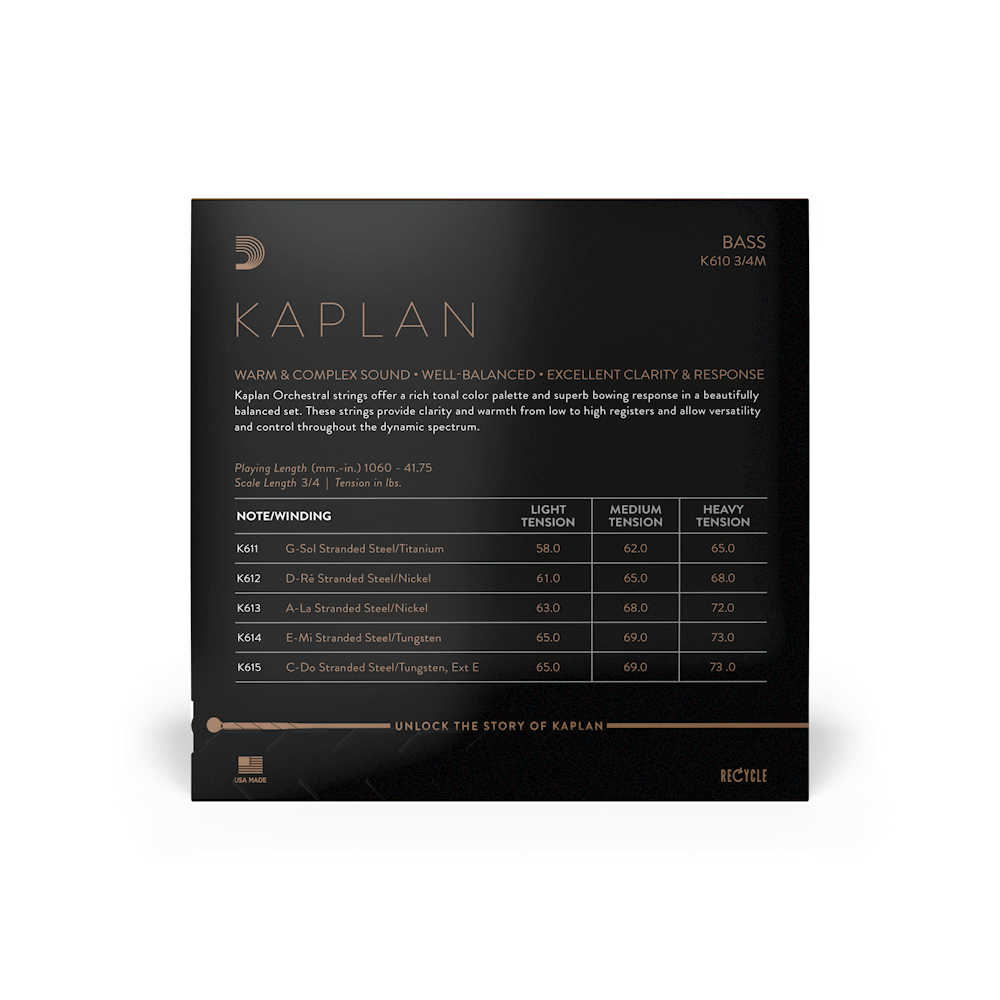 Kaplan Double Bass strings are designed for the most discerning orchestral musicians. Kaplan strings offer a rich tonal color palette and superb bowing response in a beautifully balanced set. These double bass strings provide clarity and warmth from low to high registers and allow versatility and control throughout the dynamic spectrum.