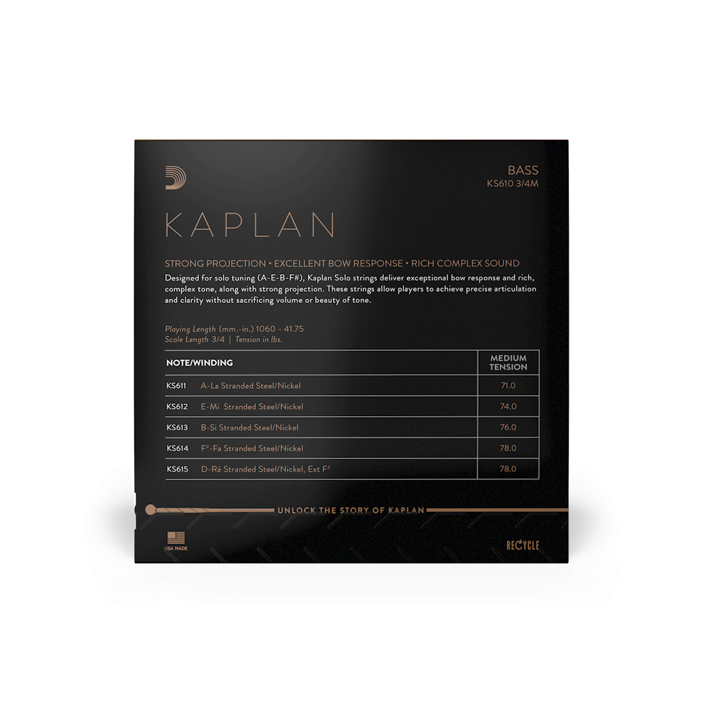 Designed for A-E-B-F# tuning, Kaplan Solo Bass strings deliver the exceptional bow response and tonal balance of Kaplan orchestral strings, along with the additional projection and clarity needed for soloistic playing. These solo bass strings are balanced across the set, allowing players to achieve precise articulation and clarity without sacrificing volume or beauty of tone.