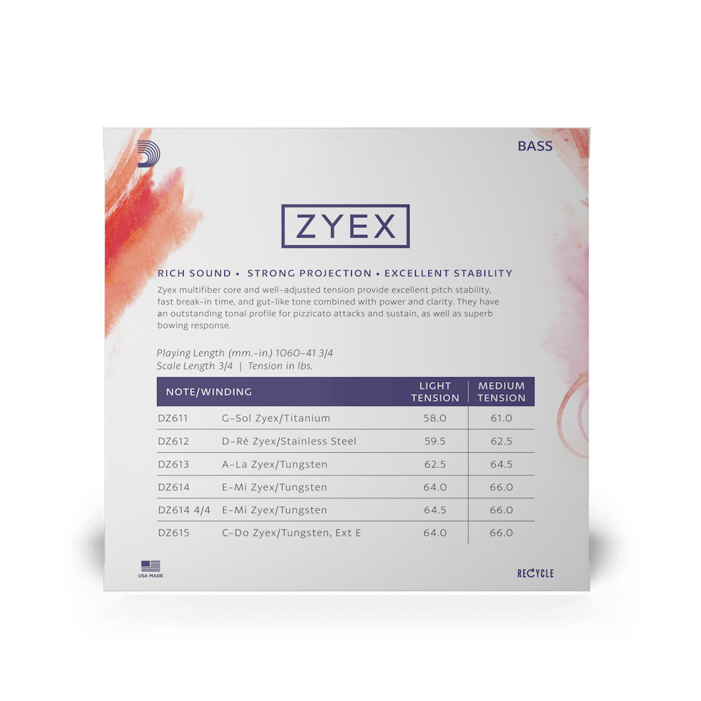 Zyex bass strings are made from a new generation of synthetic material, creating strings that are incredibly stable under varying climatic conditions. Zyex bass strings settle in on the instrument within hours, providing a rich, complex tone with power and clarity--similar to a gut string--for both pizzicato and bowing.
