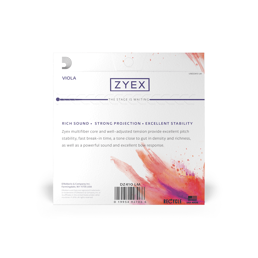 Zyex viola strings are made from a new generation of synthetic material, which produce strings that are incredibly stable under drastic climatic conditions. Within a matter of hours, Zyex viola strings settle in on the instrument with a sound that is warmer than other synthetic core strings.