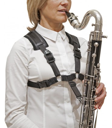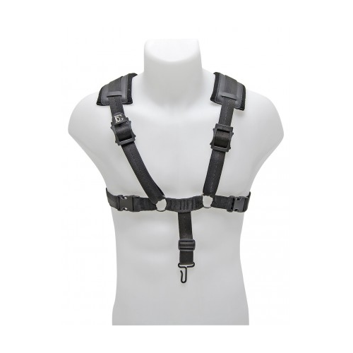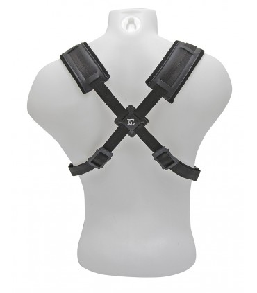 Arnês com 4 tiras ajustáveis ​​e reforço com 2 ombreiras, forrado com esponja e um gancho de metal ajustável na alça