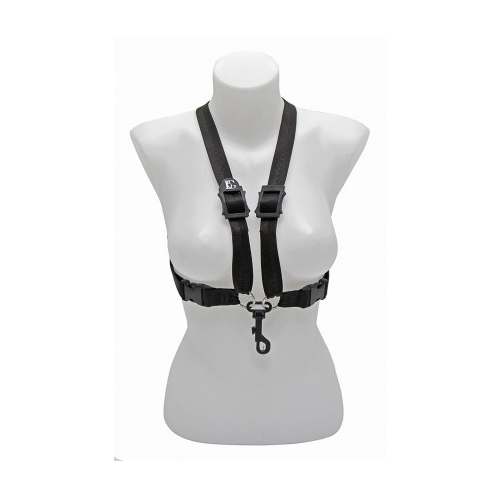 Arnês para mulheres com alças ajustáveis ​​por 4 alças e costas cruzadas, bem como um gancho de bomba fixado em 2 anéis centrais adaptados à morfologia feminina.