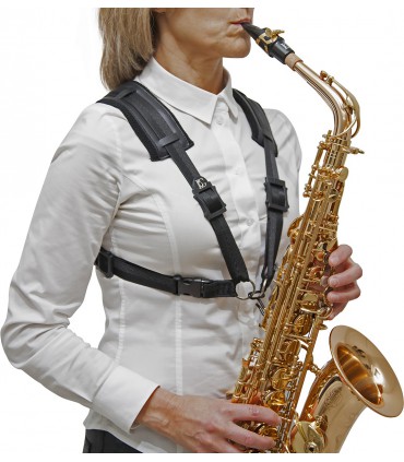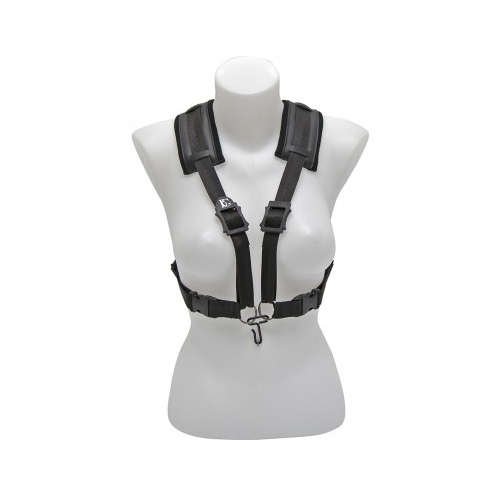 Arnês para mulheres composto por correias ajustáveis ​​por 4 voltas e costas cruzadas, além de um gancho de metal fixado em 2 argolas centrais adaptadas à morfologia feminina.