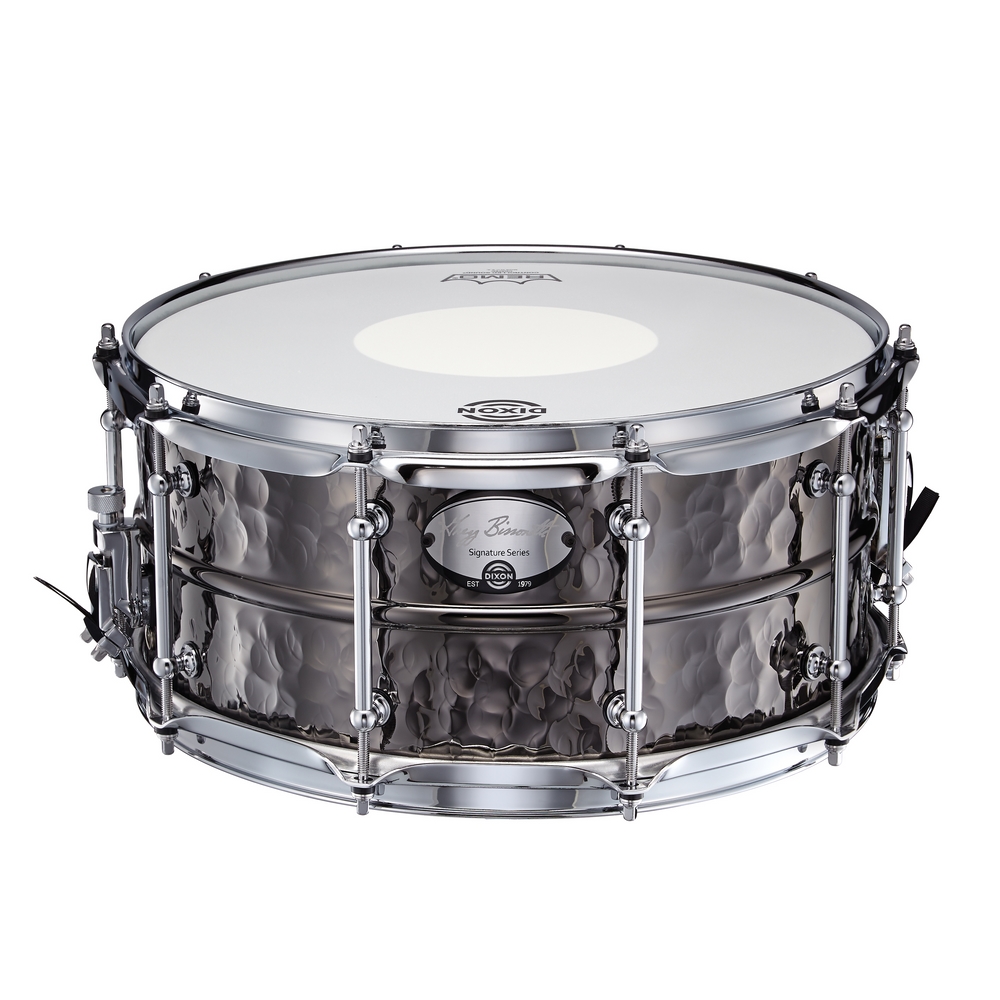 Caixa de assinatura de Gregg Bissonette. Mede 14 x 6,5 ". Casco em latão martelado e niquelado em preto. Barcas de tubo duplo. Aros flangeados triplos. Tarola ajustável. Remo USA patches