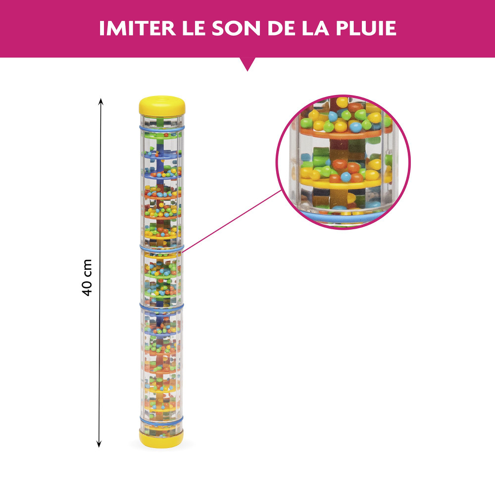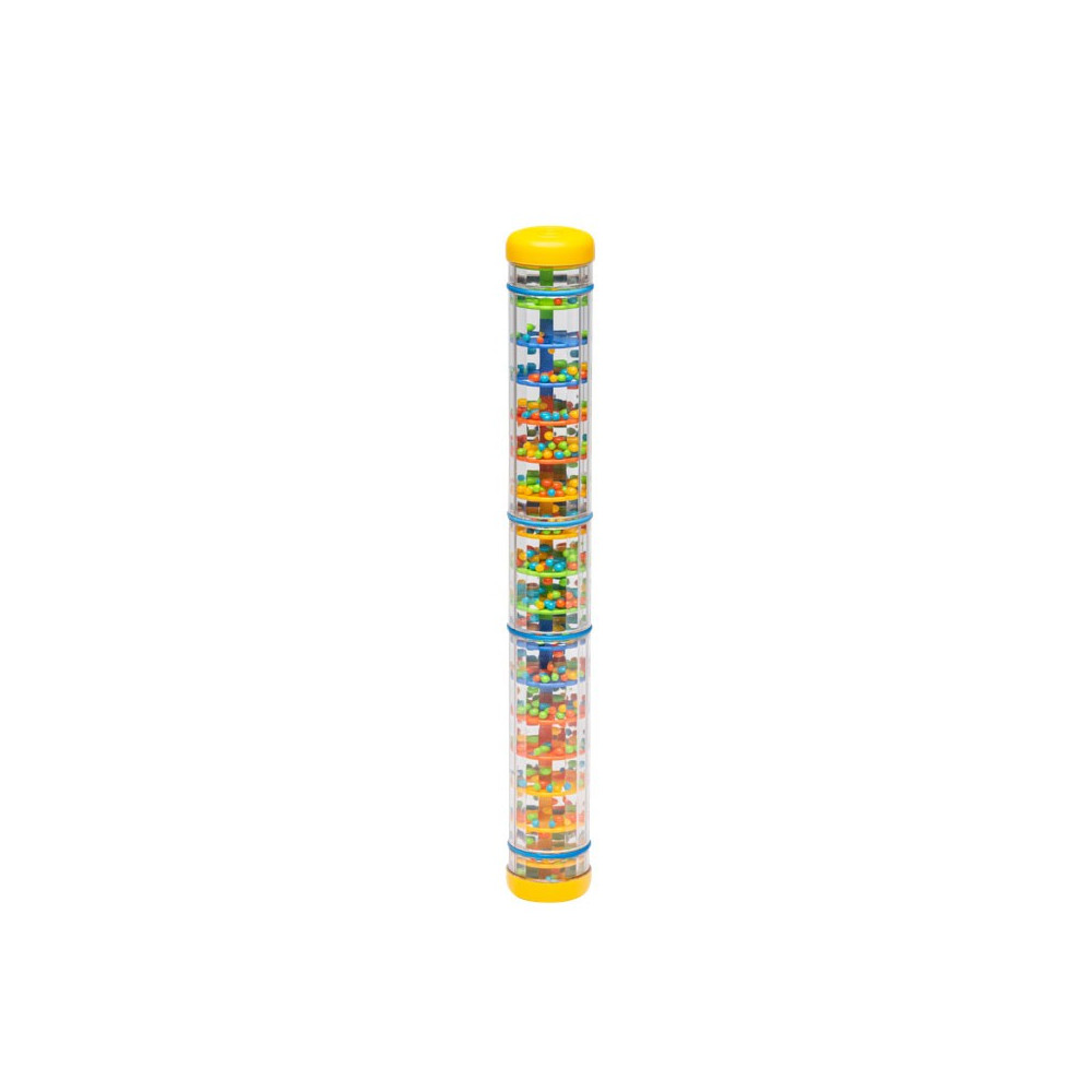 Convida a criança à manipulação jubilosa e faz com que ela queira reproduzir os gestos um grande número de vezes. Pode ajudar no relaxamento por meio do uso calmante e da transmissão de som. As contas multicoloridas deste grande bastão de chuva promovem uma estimulação rica e fascinante!
