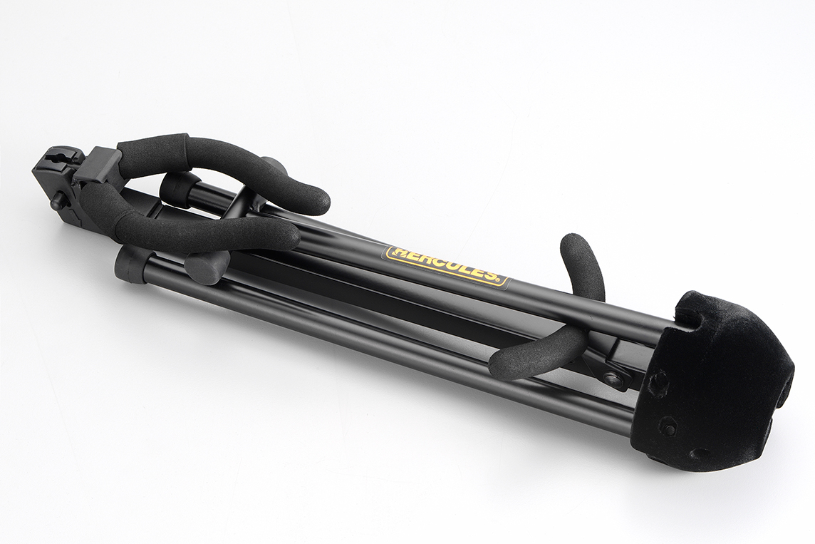 The HERCULES TravLite Tenor Saxophone Stand DS432B folds easily and compactly and stores inside the bell of the instrument; velvet pads protect the instrument.