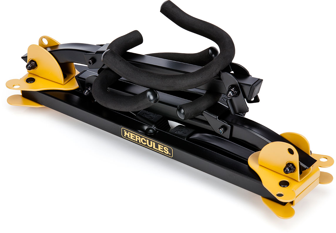 The HERCULES Double Saxophone Stand DS537B features the one-piece folding design with locking pins and can support up to 44 pounds total instrument weight.