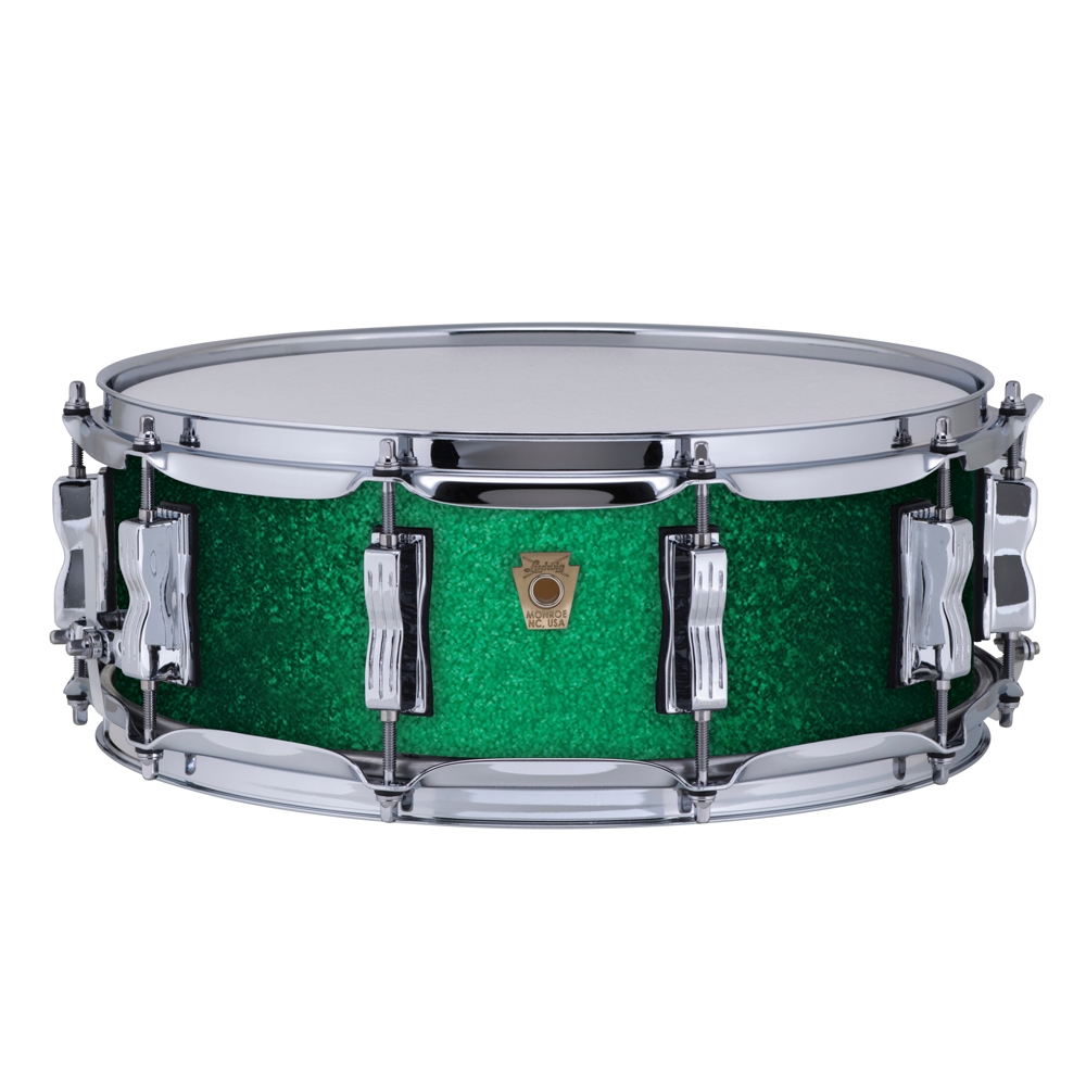 Bordo de 7 dobras e casco do álamo de 6mm. Aros Flangeados Triplos de 2,3mm. Tarola P85. Barcas gêmeas pequenas. Mede 14 "x 5". Feito no acabamento Sparkle verde dos EUA.