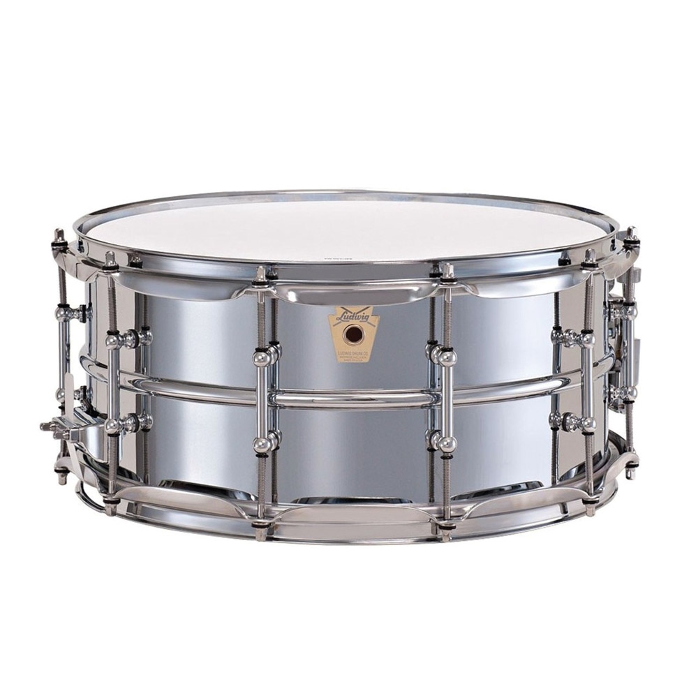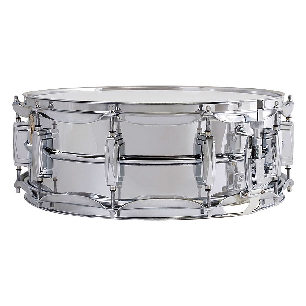 Casco em alumínio cromado de 1,7 mm. Barcas imperiais ou em tubo. Aros Flangeados Triplos de 2,3mm. Tarola Supraphonic P84. 10 tensores. Patches Ludwig Weather Master. Feito nos EUA.