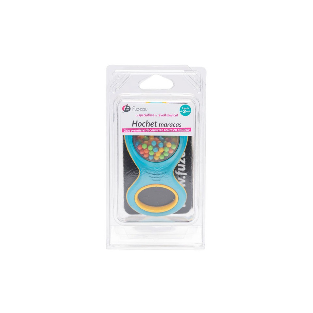 Chocalho de maracas pequeno em plástico colorido, com formas, cores e sons muito suaves para os mais pequenos. As bolas coloridas visíveis pela transparência também são estimulantes para a vista. Oferecido em um blister transparente, este chocalho de maracás é facilmente posicionado em um visor de pinos.