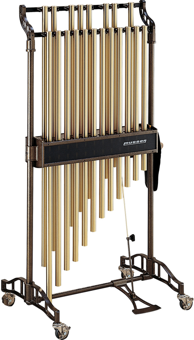 Musser Classic Chimes are ideal for school use. Superbly crafted 1.5-octave chimes are chrome plated or brass polished to deliver outstanding resonance and carrying power. Each seamless tube is suspended by its own stainless steel cable and has a full 1 1⁄4 inch outside diameter. Chimes are easy to transport with a selection of concert frames and carts. Standard concert frames have locking casters while All-Terrain Carts features 10-inch pneumatic wheels to provide smooth transport over rough terrain. A rawhide chime mallet and detachable mallet holder is supplied with every set of chimes.