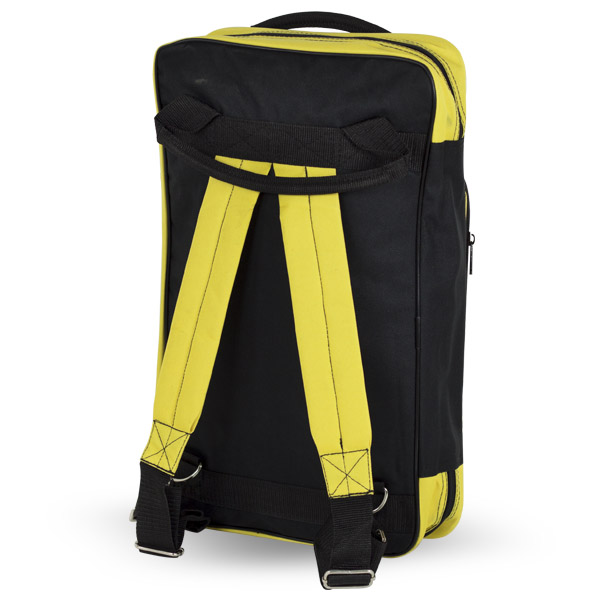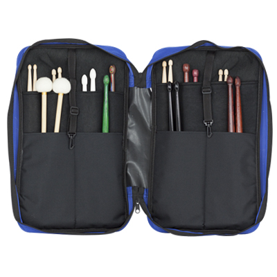 Estojo de poliéster plastificadas com estofamento de 10mm. Alças, mochilas fixas e dois bolsos para partituras. Interior com 8 compartimentos para baquetas. Bolso: 24x33x3cm. Medida: 46x28x8cm.