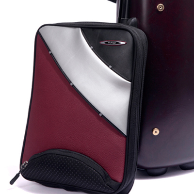 Estojos em material semelhante à fibra de carbono, dois bolsos removíveis, bolso com capa de chuva, três alças, fecho de correr e cadeado de segurança com senha. Cordão, mochila e pano de limpeza. 83x30x19cm.