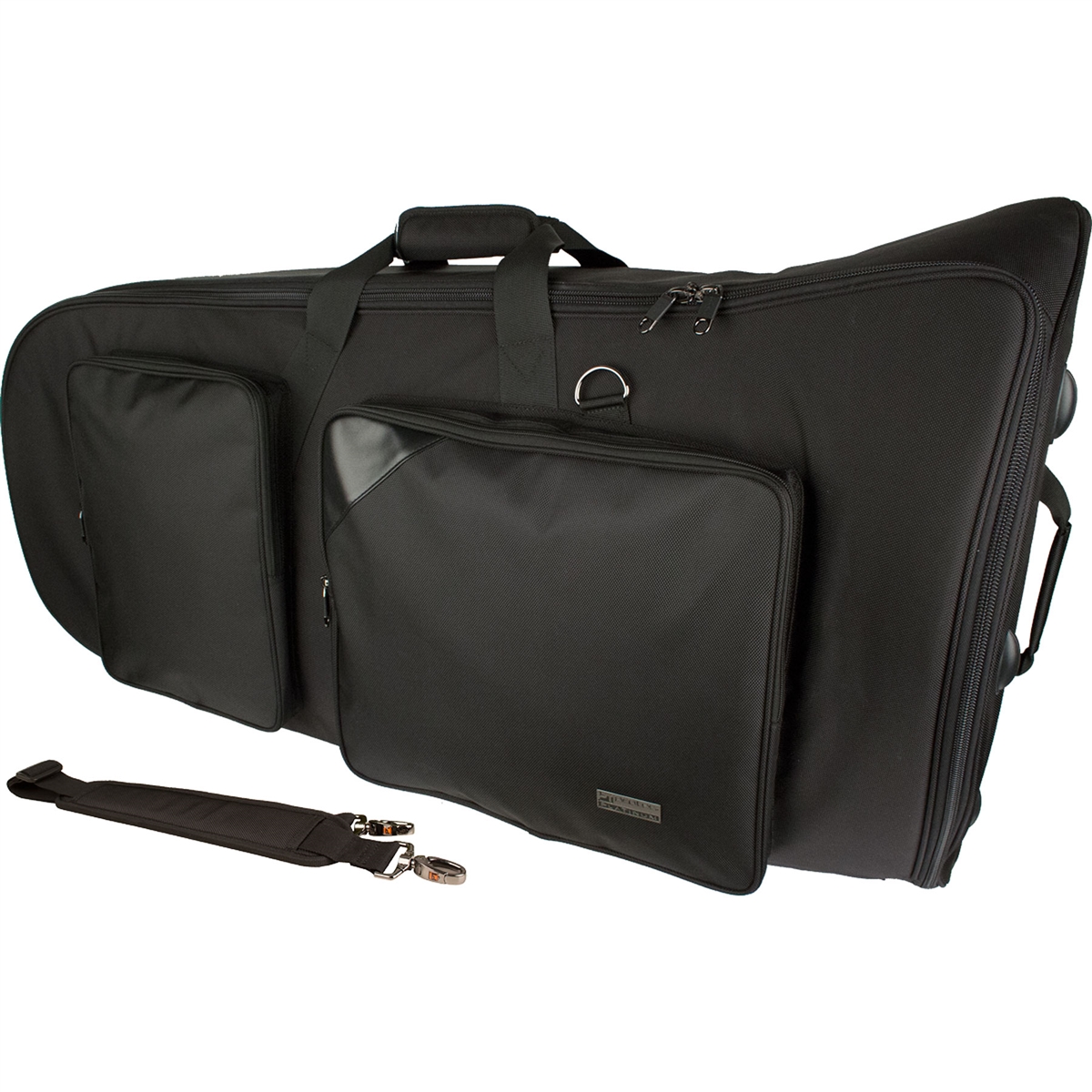 2 bolsos externos grandes com bolsa e organizador de bocal duplo Exterior em nylon Grande abertura de instrumento para fácil acesso Hardware de metal personalizado Pés de borracha moldados duráveis Sotaque de couro frontal monogramável Características interiores