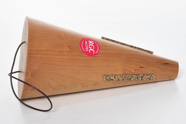 Sordina de trompa con forma cónica, fabricada en madera de cerezo americano y fibras naturales. Refuerzo de anillo de cobre en la entrada de aire de la sordina.