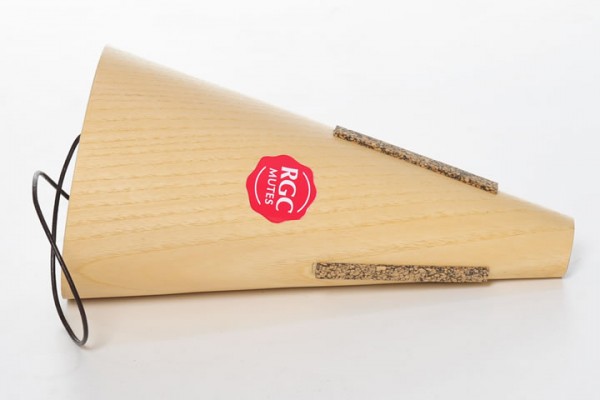 Sordina de trompa con forma cónica, fabricada en madera de fresno frisé y fibras naturales. Refuerzo de anillo de cobre en la entrada de aire de la sordina.