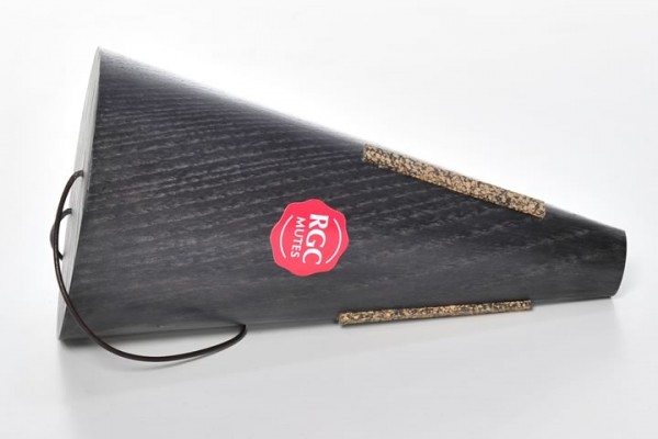 Sordina de trompa con forma cónica, fabricada en madera de fresno frisé y fibras naturales, con tinte de color negro al agua. Refuerzo de anillo de cobre en la entrada de aire de la sordina.