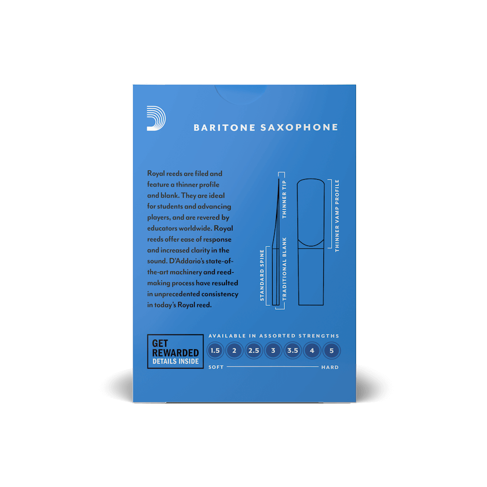 Featuring a filed cut for additional tonal clarity, Royal by D'Addario Baritone Saxophone reeds are ideal for both beginning and advancing players. These reeds have a traditional blank and profile to give you an ease of response when playing.