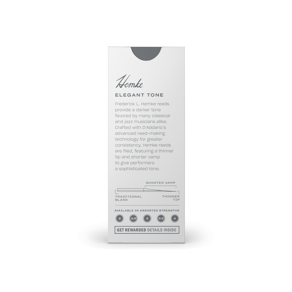 A wide variety of musicians prefer Frederick L. Hemke reeds because their filed, thinner tip and shorter vamp provide both beginners and seasoned performers with a warm, sophisticated tone.