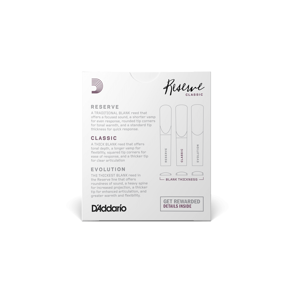 Crafted with a longer vamp for flexibility of color and volume, the Reserve Classic Bb Clarinet reeds offer the depth of tone you're seeking for your instrument. These reeds contain squared tip corners for ease of response, plus a thicker tip for added support.