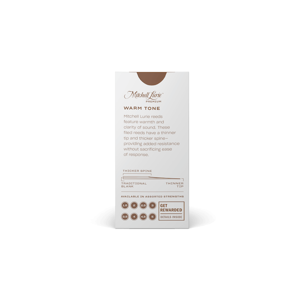 Mitchell Lurie Bb Clarinet reeds are the go-to choice for advancing players, providing the warmth and clarity of sound necessary to take your playing to the next level. These reeds are unfiled, featuring a thinner tip and thicker spine--which add resistance without sacrificing ease of response.