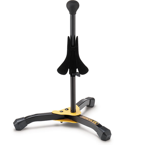 O suporte para saxofone soprano HERCULES DS531BB e as pernas giratórias fornecem um suporte estável e seguro para saxofones soprano.