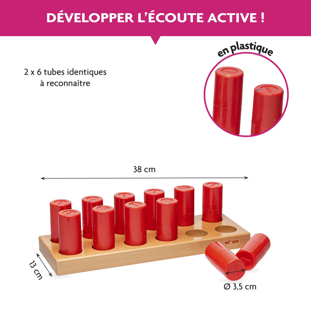 Cada tubo é preenchido com uma variedade de materiais, em diferentes quantidades. Quando os tubos são agitados, vários sons são produzidos: alto, baixo, muito baixo, … As duas filas de tubos são idênticas. Eles podem, portanto, ser usados ​​em pares ou para jogos de reconhecimento e audição.
