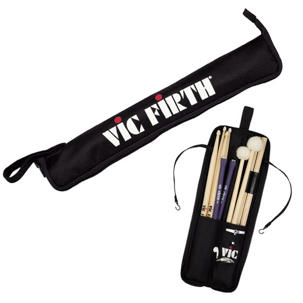 Como o nome indica, é de levar o essencial, você pode colocar 4 ou 5 pares de baquetas, pincéis ou macetas. Ele pode ser aberto e possui uma alça para pendurá-lo na base ou na caixa. Com um pequeno bolso para colocar acessórios e uma borracha para a chave da bateria. Fechado, ocupa o espaço mínimo.