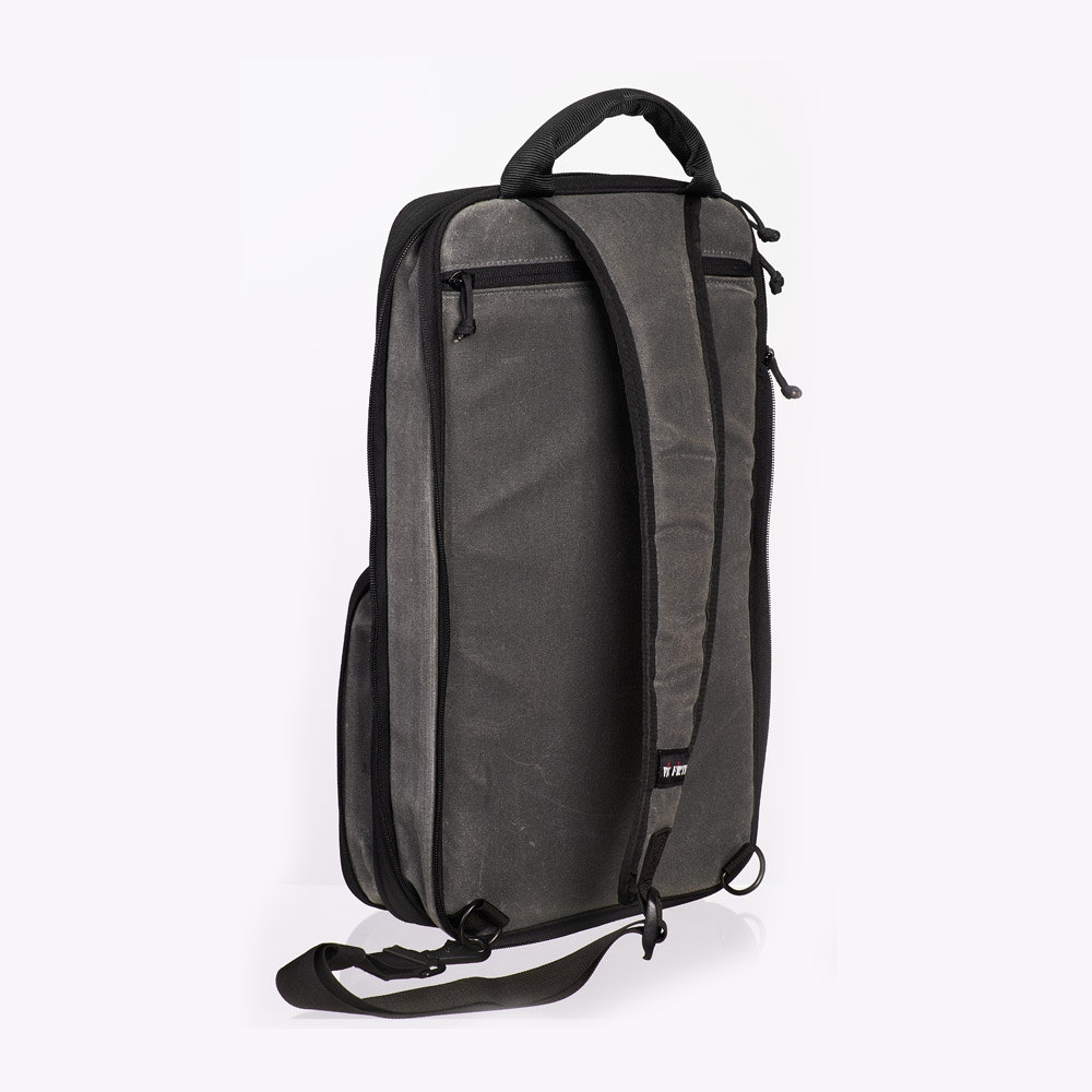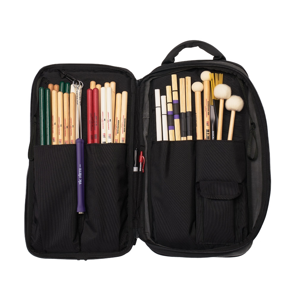 Bolsa de ombro profissional feita de lona encerada com um visual vintage. Possui alça de ombro e capacidade para 24 pares de paus ou marretas, música e tablet.