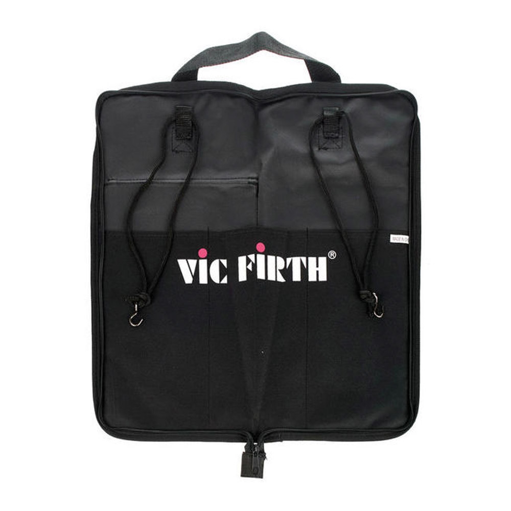 Bolsa de baquetas padrão. Até 12 pares. Possui 3 bolsos internos para baquetas, vassouras e rod's, e um bolso externo para acessórios. Com tiras para pendurar na base ou na caixa. Nylon forte.